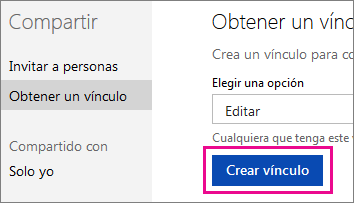 - Haga clic en obtener un vínculo, elija Editar (u otra opción si no desea que los usuarios editen) y, a continuación, haga clic en crear vínculo.